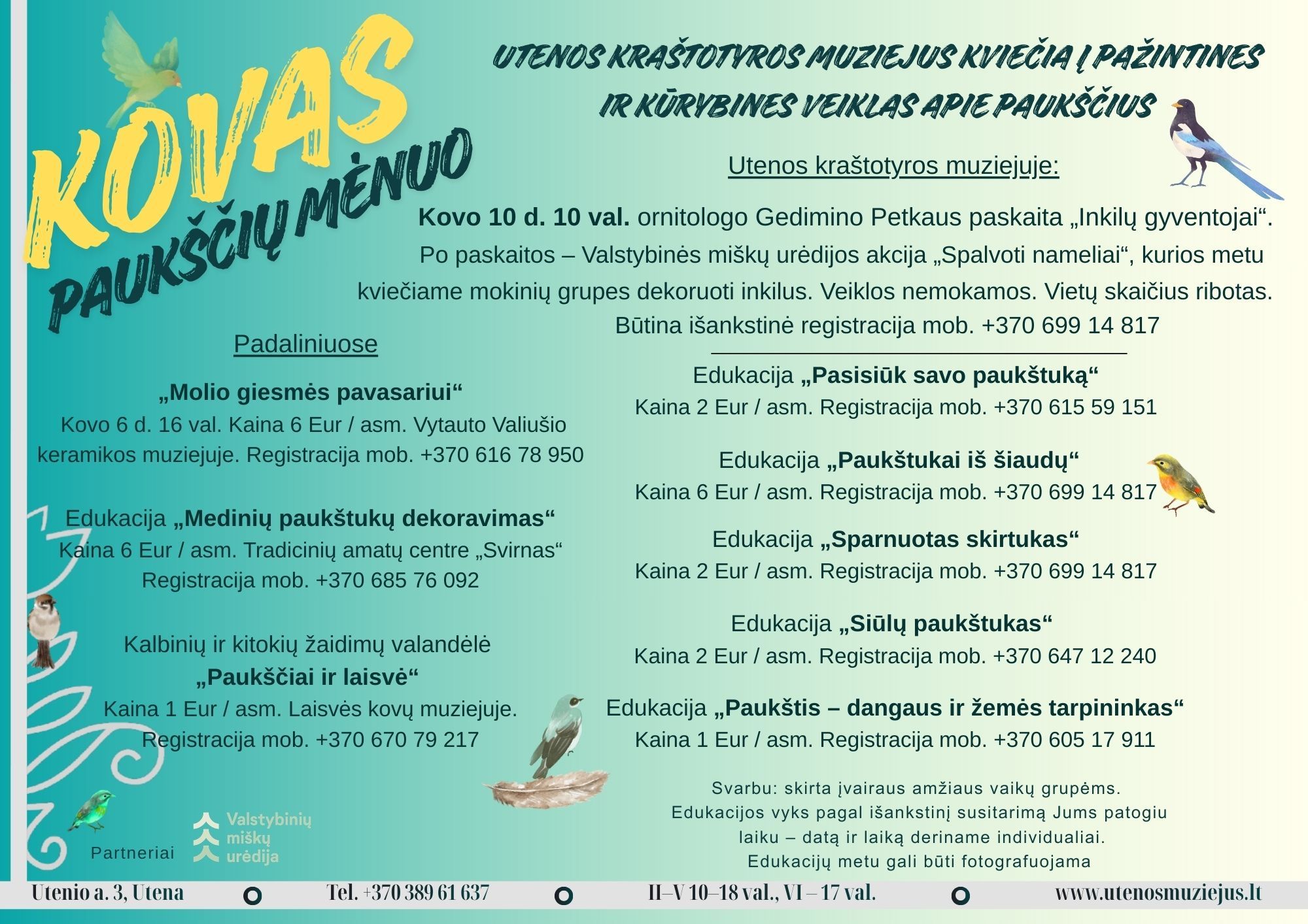 • Kovo 10 d. 10 val. – pažintinė paskaita „Inkilų gyventojai“ ir Valstybinės miškų urėdijos akcija „Spalvoti nameliai“.