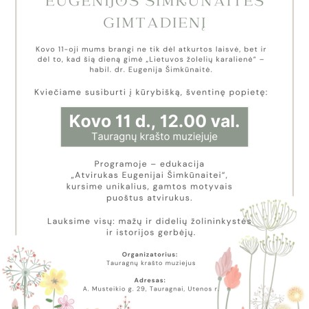 2026 m. kovo 11 d. 12 val. Tauragnų krašto muziejuje edukacija „Atvirukas Eugenijai Šimkūnaitei“