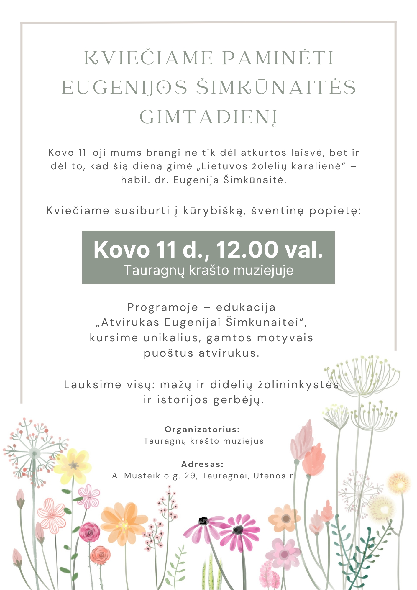 Kviečiame paminėti Eugenijos Šimkūnaitės gimimo dieną kartu! Edukacijos metu kursime unikalius, gamtos motyvais puoštus atvirukus. Lauksime visų: mažų ir didelių žolininkystės ir istorijos gerbėjų.